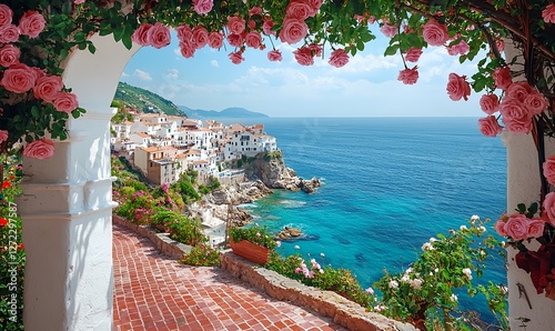 White arch with pink roses framing coastal town and sea along a sunny path in southern Italy