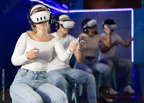 Girls and guys friends, after participating in virtual game, space flight, share their impressions. Students animatedly retell occasion of game. Immersive technologies XR VR AR