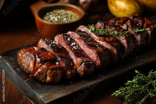 Tradicional churrasco brasileiro. Suculenta picanha assada e fatiada sobre uma tábua de corte em madeira