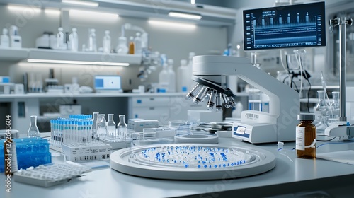 Close up view of a sophisticated DNA sequencing machine surrounded by various laboratory equipment and instrumentation in a well lit high tech research facility