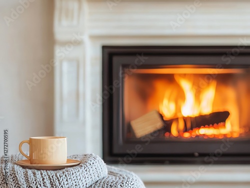 Cozy living room scene with a warm fire, a cup of tea, and soft textiles
