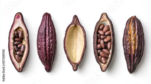 Evolution of cacao pods, botanical specimen layout, vibrant maroon fruit exterior, split pod showing pale flesh, fermented beans, dark roasted seeds, clinical lighting, high resolution detail, pure