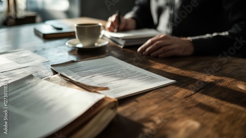 Detective reviewing case files on a desk with coffee. Featuring focus and analysis