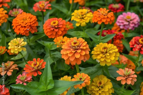 Colorful garden of blooming zinnia flowers during a sunny day in a vibrant botanical park