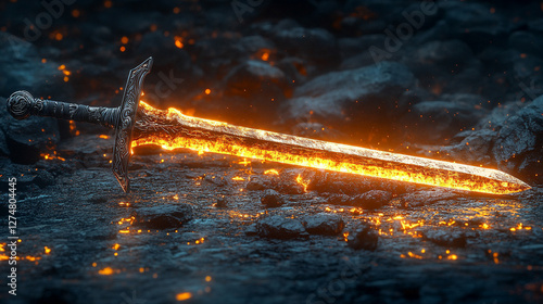 shiny modern sword standing on rocky ground, symbolizing strength, power, and resilience, reflecting a warrior's spirit and determination