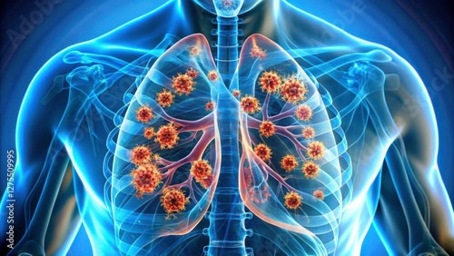 3D Medical Illustration of Human Lungs with Virus Particles Present