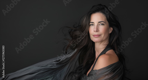 Portret eleganckiej kobiety z rozwianymi włosami na ciemnym tle.
