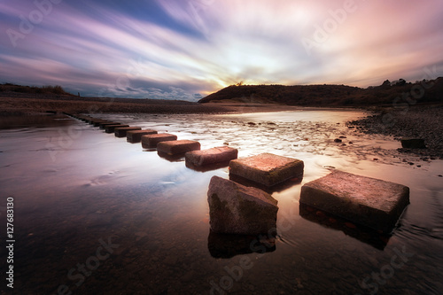 Three Cliffs Bay stepping stones Sunset at the stepping stones that allow access to the divided beaches at Three Cliffs Bay on the Gower peninsula in Swansea, South Wales