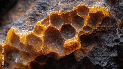 Macro shot of crystallized propolis resin showcasing rich golden hues and intricate details in a natural setting