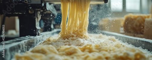 Fresh pasta making in factory with flour dust and rolling machine