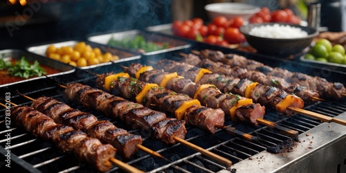 Grilled Skewers of Meats and Vegetables on Brazilian Barbecue with Fresh Ingredients in Background and Copy Space for Text