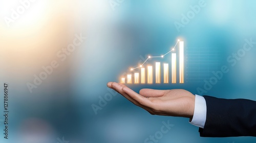 A hand holding a rising bar graph symbolizing growth and success in a blurred background.