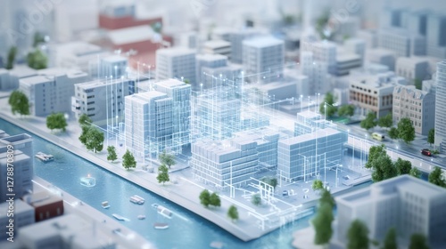 Aerial view of a futuristic urban landscape with digital infrastructure and waterways