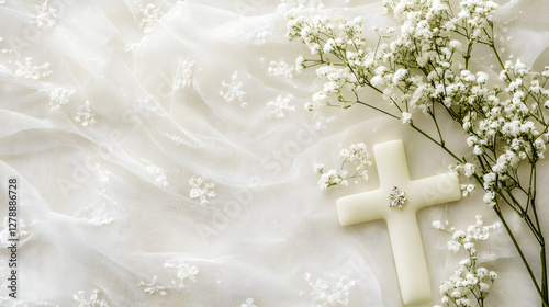 un fondo con tela de encaje con espacio de copia en colores claros elegantes con ramas de flores pequeñas color blanco y una cruz catolica para invitacion o tarjeta de celebracion