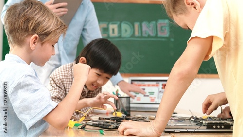 Group of diverse student working together on main board with laptop screen display engineering prompt written while teacher hold tablet and explain online software at STEM technology class. Pedagogy.