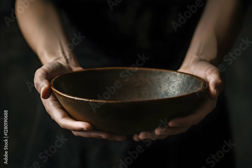 Hands offering an empty wooden bowl in dim lighting studio setup