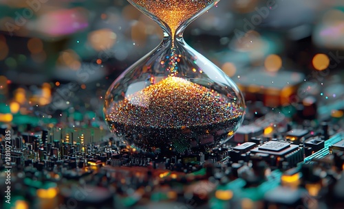An illuminated hourglass on a circuit board, embodying the concepts of time, technology, and the rapidly evolving digital landscape