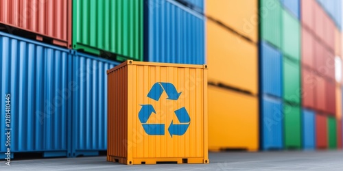 Recycle eco-friendly renewal concept. A vibrant orange recycling container stands in front of colorful shipping containers, emphasizing sustainability and eco-friendliness in a modern setting.