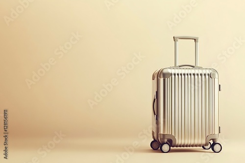 Silver carry-on suitcase standing on beige background symbolizing travel and business trips