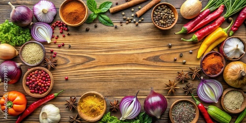 Aromatic spices and onions arranged in a colorful pattern on a wooden cutting board, aroma, culinary, aroma, culinary