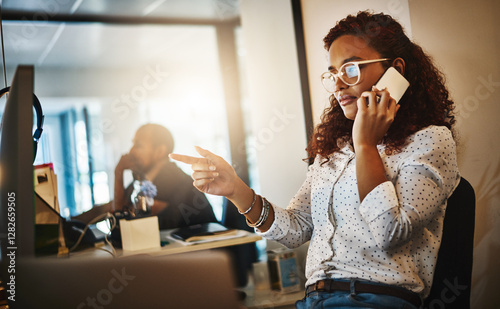Phone call, night and woman in office, computer and conversation with communication. Business people, evening and employee in workplace, pc or internet with network, discussion or email with chatting