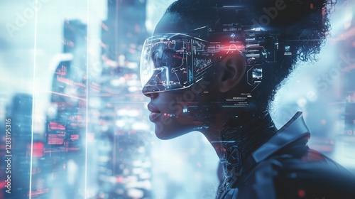 Vision of Tomorrow: A futuristic woman wearing high-tech glasses stares out at a cityscape.