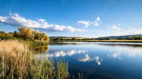 Stunning landscape of a serene lake reflecting clouds and trees under a bright blue sky : Generative AI