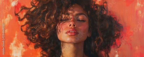 Portrait of a young woman with curly hair in vibrant expressionist style on bold red background