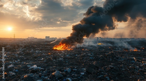 Pollution and Environmental Damage from Burning Trash in Urban Landscape at Sunset
