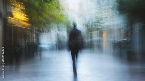 Blurred Image of a Solitary Figure Walking Through an Urban Street at Dusk : Generative AI