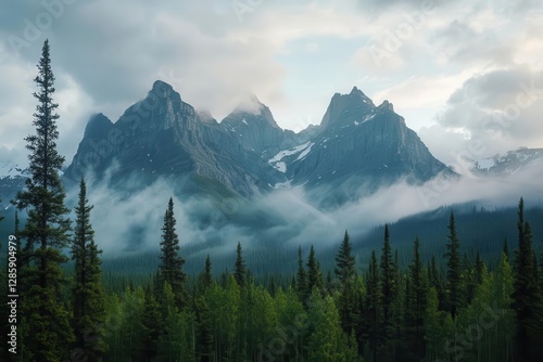 majestic mountain range shrouded in ethereal morning mist layered peaks emerging through clouds pristine alpine forest in foreground dramatic atmospheric lighting