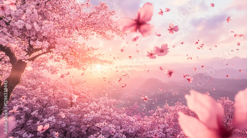桜の花びらが舞う美しい春の夕暮れ
