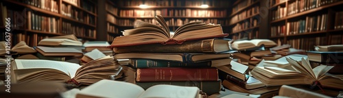 Pile of open books with detailed pages, study tools, and learning materials scattered around, academic backdrop with bookshelves, soft lighting, highresolution, 16K detail