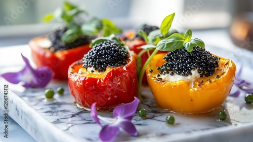 Elegant black truffle-infused ricotta stuffed peppers, plated with caviar pearls and micro basil on a marble plate