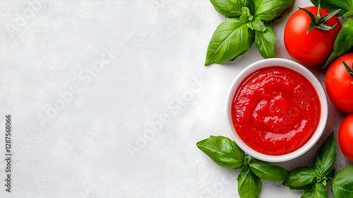 Tomato sauce, basil, tomatoes on white background. Food recipe, cooking