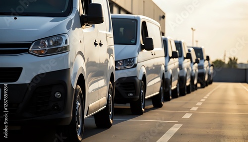 Line of white delivery vans parked at a distribution center