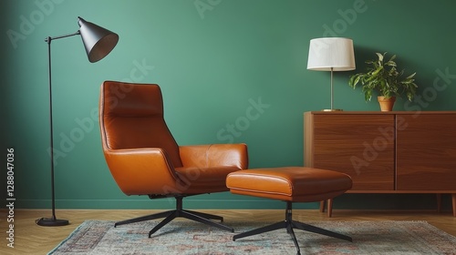 A minimalist 70s-style living room, complete with an armchair, a lamp, and a small table, is presented in this stock image