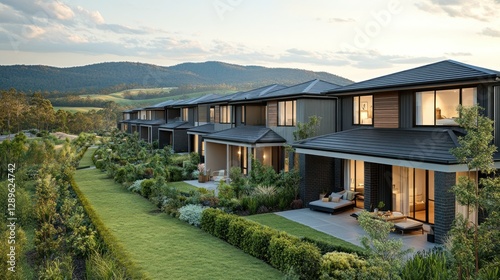 Modern townhomes, tranquil hillside setting, landscaped gardens, sunrise view