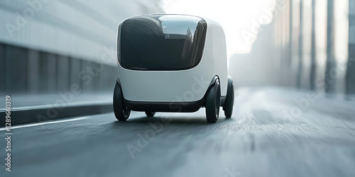 A modern delivery robot rides with a box down a city street. Automated delivery by a robot on wheels.
