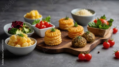 Assortment of Exquisite Gourmet Food on Rustic Wooden Board Featuring a Variety of Delicious Appetizers on Gray Table Surface