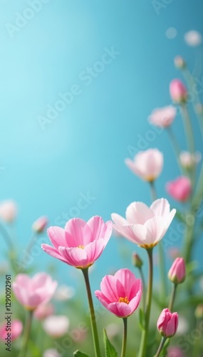 Soft pink and white flowers against a bright blue Spring celebratory scene , scene, floral