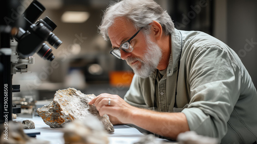 Expert geologist examines rock specimen in a research laboratory setting during afternoon hours