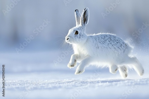 A lively white rabbit gracefully leaps across a snowy landscape, showcasing its agility and the beauty of winter's serene environment.