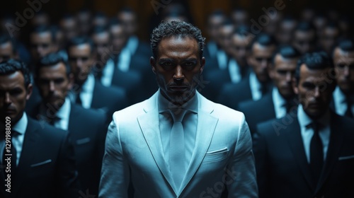 Man in white suit standing among a group of men in black suits, intense atmosphere. Leadership and individuality concept