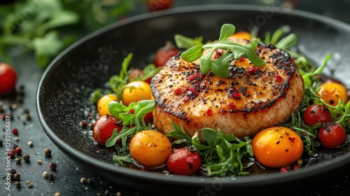 Grilled chicken breast, fillet, steak and fresh vegetable salad, side view, copy space. Healthy keto, ketogenic lunch menu with chicken meat and organic veggies and greens.