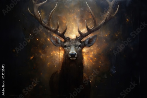 Mystical deer stag with antlers against dark magical forest background with glowing sparkles and golden light. Fantasy wildlife art for spiritual concept design