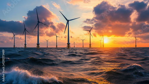 荒波の向こうにそびえる風力タービン – 夕焼けに映える未来エネルギー