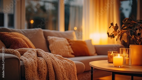 A cozy autumn-inspired living room with warm tones, knitted blankets, and soft candlelight.