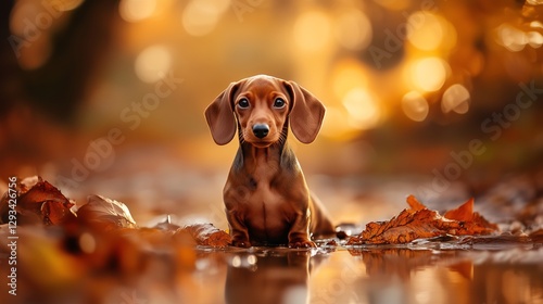 Młody jamnik w jesiennym lesie otoczony złotymi liśćmi