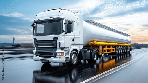 A truck navigates a highway under a clear sky, showcasing its robust design and the open road ahead in a dynamic driving scene.